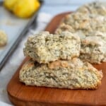 These Lemon Poppy Seed Sourdough Scones are light, flaky and filled with sweet lemon flavor that balances perfectly with sourdough discard and the texture of poppy seeds. Drizzle the scones with a sweet lemon glaze for the perfect breakfast!